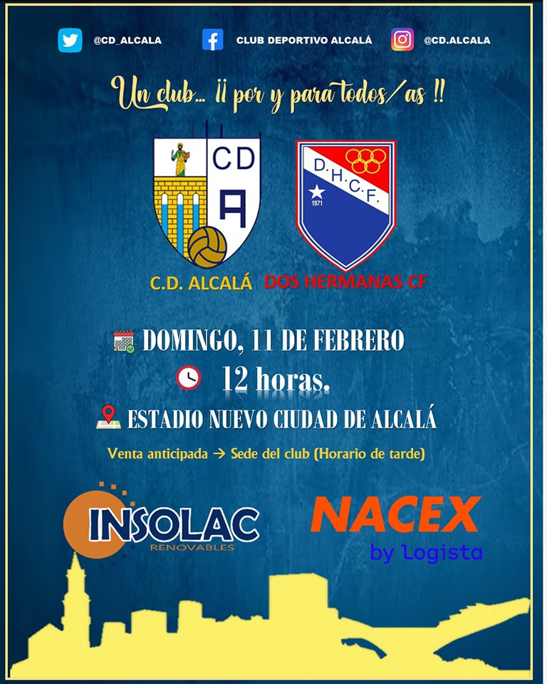 El CD Alcalá se encuentra en la zona alta de la tabla, concretamente en la segunda posición a 10 puntos del líder, el Dos Hermanas CF, que llegará con las sanas intenciones de seguir sumando, pero lo que no sabe que tiene en contra al CD Alcalá y toda su afición, por tal motivo, desde la Junta Directiva se quiere hacer un llamamiento para que los aficionados de la entidad alcalareña arropen al equipo y sea el dorsal de leyenda en este atractivo partido que enfrentan a los dos primeros de la competición.