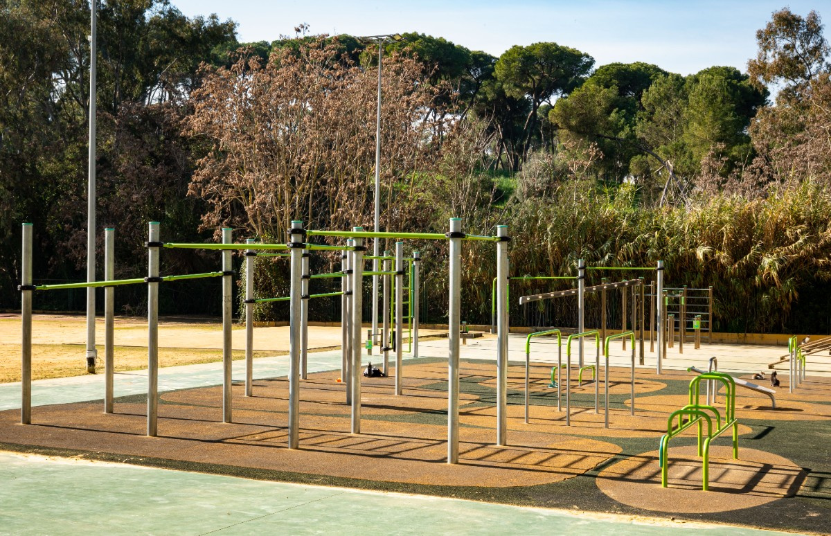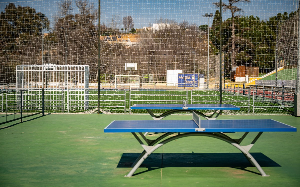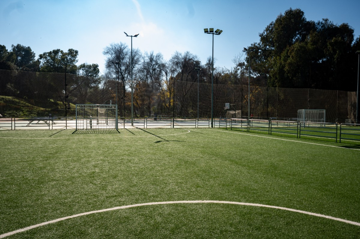 Dos campos de fútbol sala de césped artificial, pista de atletismo de 250m con foso para saltos de longitud, tres campos de mini basket, pista multideportiva para fútbol y baloncesto.