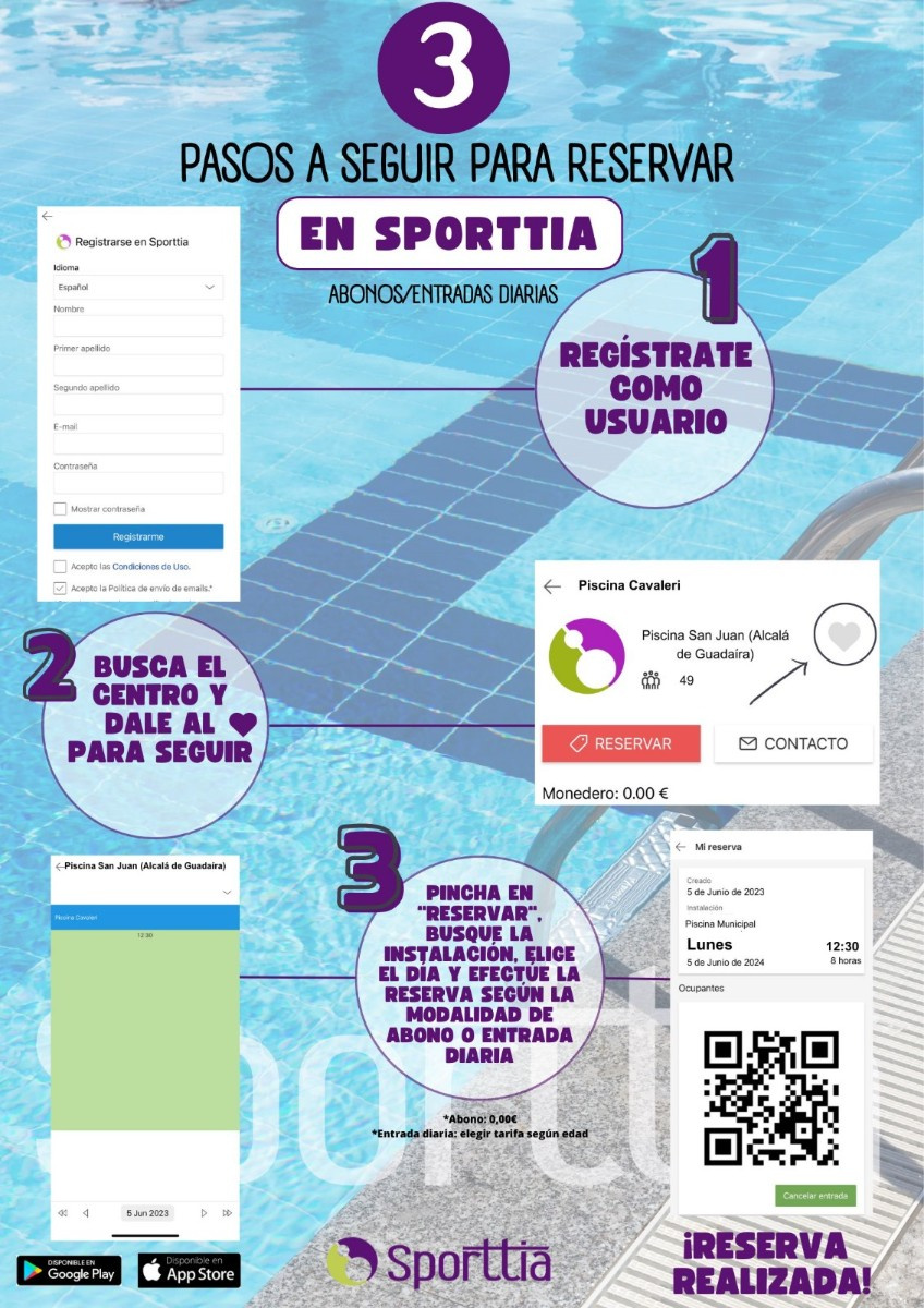 La Delegación de Deportes del Ayuntamiento, pone a disposición una APP (https://app.sporttia.com/login) donde los abonados de la piscina de verano de San Juan, abierta desde este pasado martes, puedan reservar plaza el día que vayan a asistir. El objetivo de esta novedad es ofrecer mayor comodidad a los usuarios de la piscina de verano y posibilitar un acceso más ordenado y sin colas en taquilla que garantice el disfrute de toda la población que lo requiera hasta completar aforo y no se reserve cupo para abonados que finalmente no asistan. Igualmente permite a los usuarios no abonados la reserva y pago de entrada de forma adelantada.